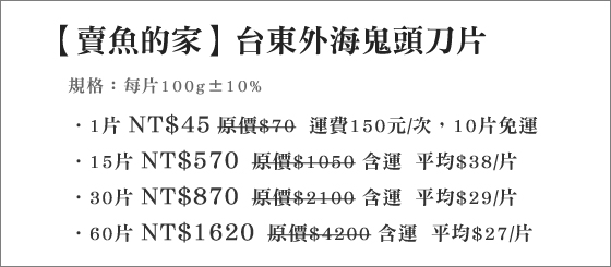 .....宅配台東外海鬼頭刀海魚傳奇美味,頂級新鮮口感,軟嫩甘甜、入口即化,香煎魚排、紅燒、煮湯都營養好吃!
