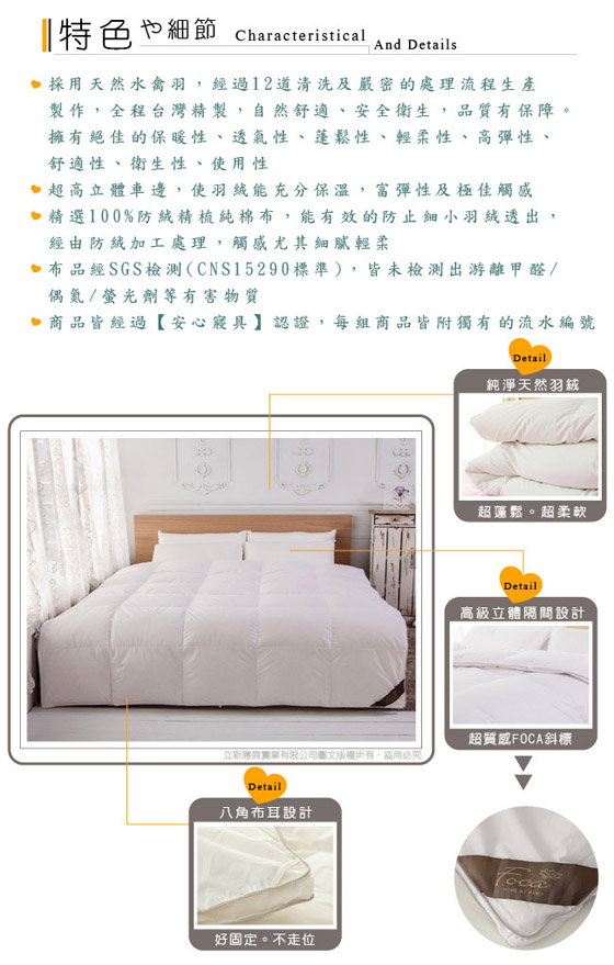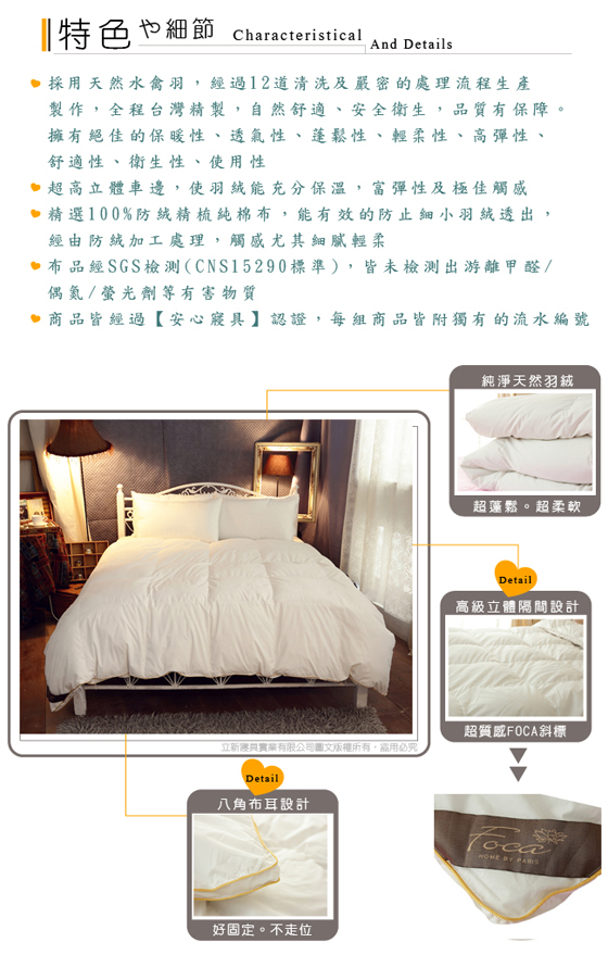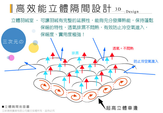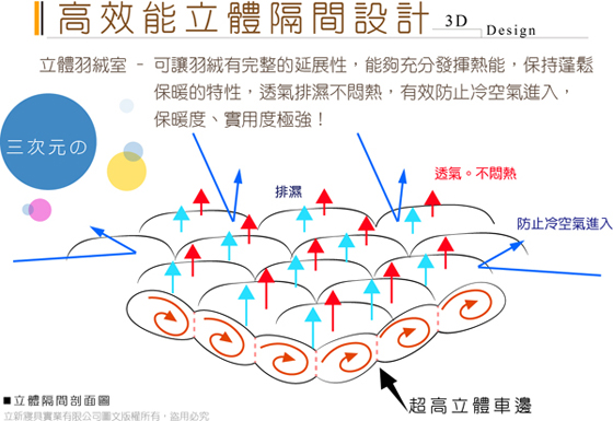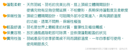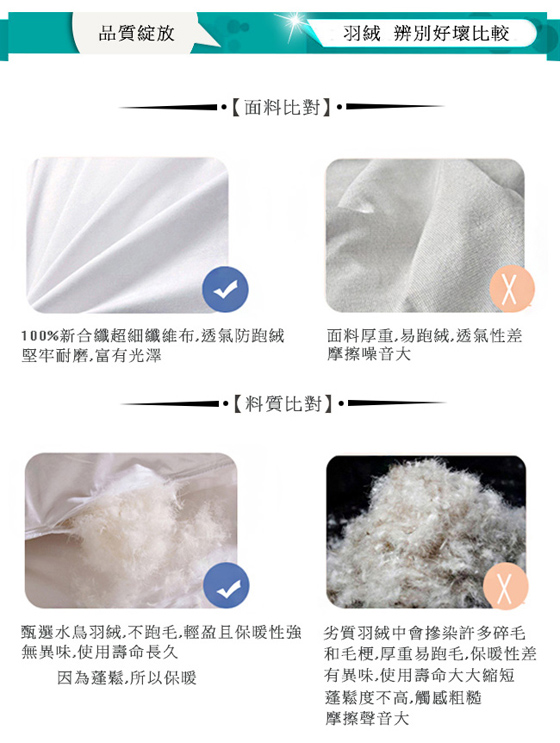 ◆材質:內容物98D/2F羽絨(±5%);表布:頂級長纖純棉防絨布(立體車邊設計)