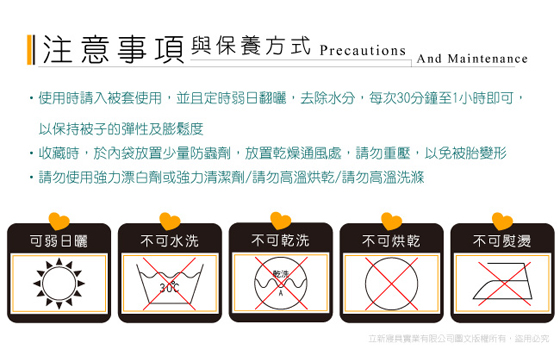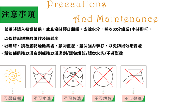 1.使用時請入被套使用,並且定時弱日曬,每次30分鐘至1小時即可,可達到消毒,去溼及殺菌之效果,可恢復彈性,延長使用期限